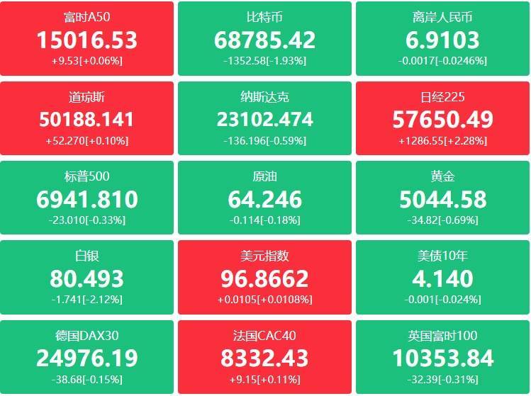 外盘:零卖数据不足预期且商场对东说念主工智能冲击金融业的担忧加重,好意思股收盘走势分化,其中说念指涨52.27点,涨幅0.10%报50188.14点,纳指跌136.20点,跌幅0.59%报23102.47点,标普500跌23.01点,跌幅0.33%报6941.81点;科技股涨跌不一,甲骨文涨超2%,特斯拉涨超1%,谷歌、博通跌超1%;万豪货仓涨超8%,希尔顿货仓涨超3%,西部数据跌超8%,闪迪跌超7%,希捷科技跌超6%,Strategy跌近4%;中概股多量走高,中概股龙头指数收涨1.07%,汽车之家涨超4%,腾讯音乐涨超3%,理念念汽车涨近3%,阿里巴巴涨超2%,小鹏汽车、蔚来、京东涨超1%。