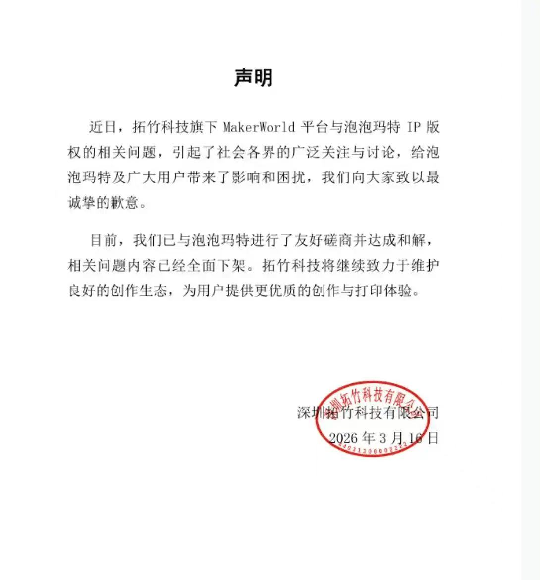3月16日,销耗级3D打印头部企业拓竹科技(Bambu Lab)与潮玩巨头泡泡玛特(Pop Mart)连合晓谕,两边就旗下MakerWorld平台波及泡泡玛特IP版权的关连问题已进行友好讨论并终了息争。